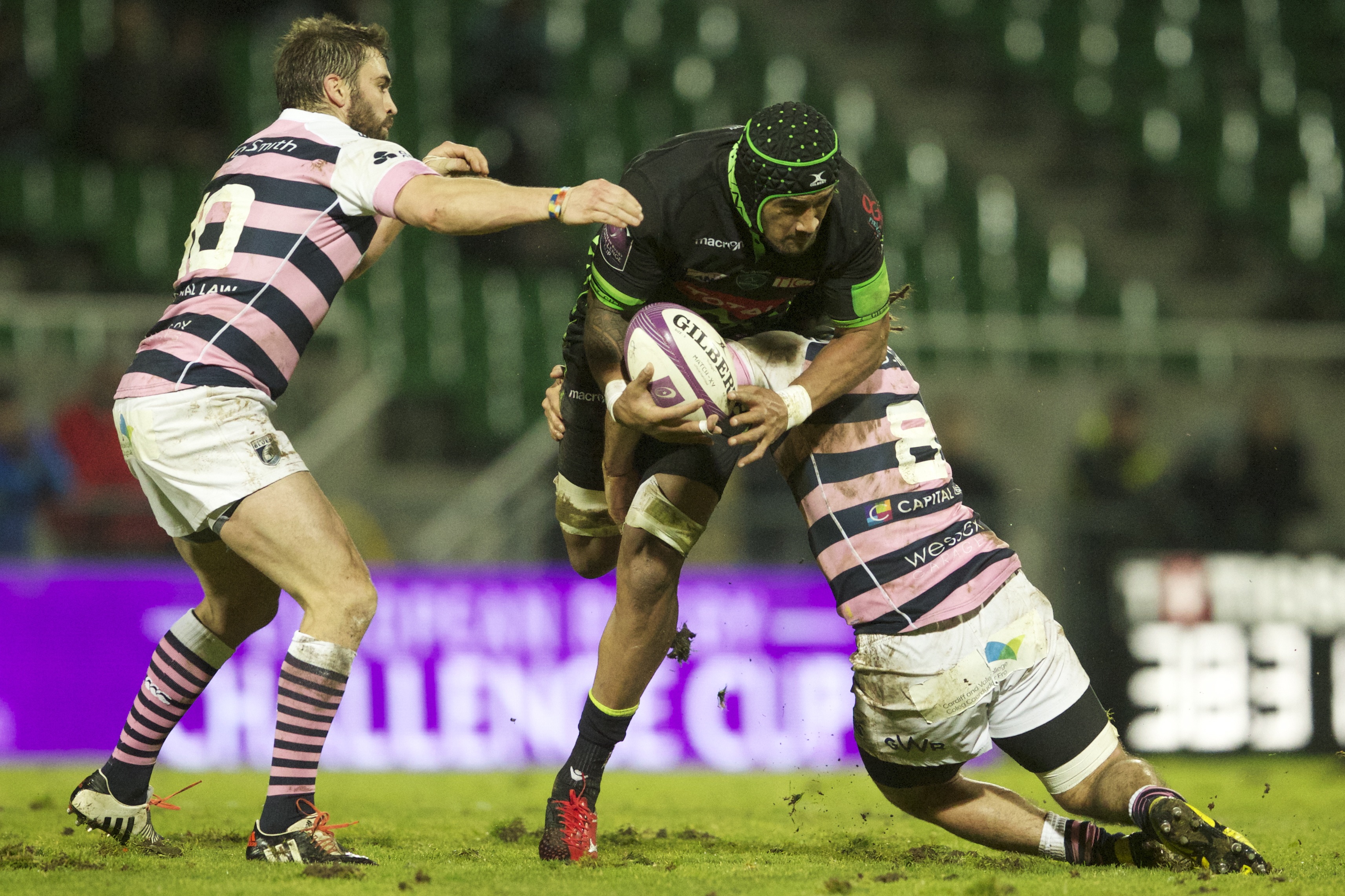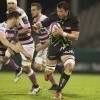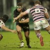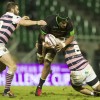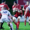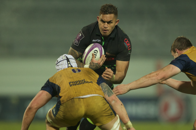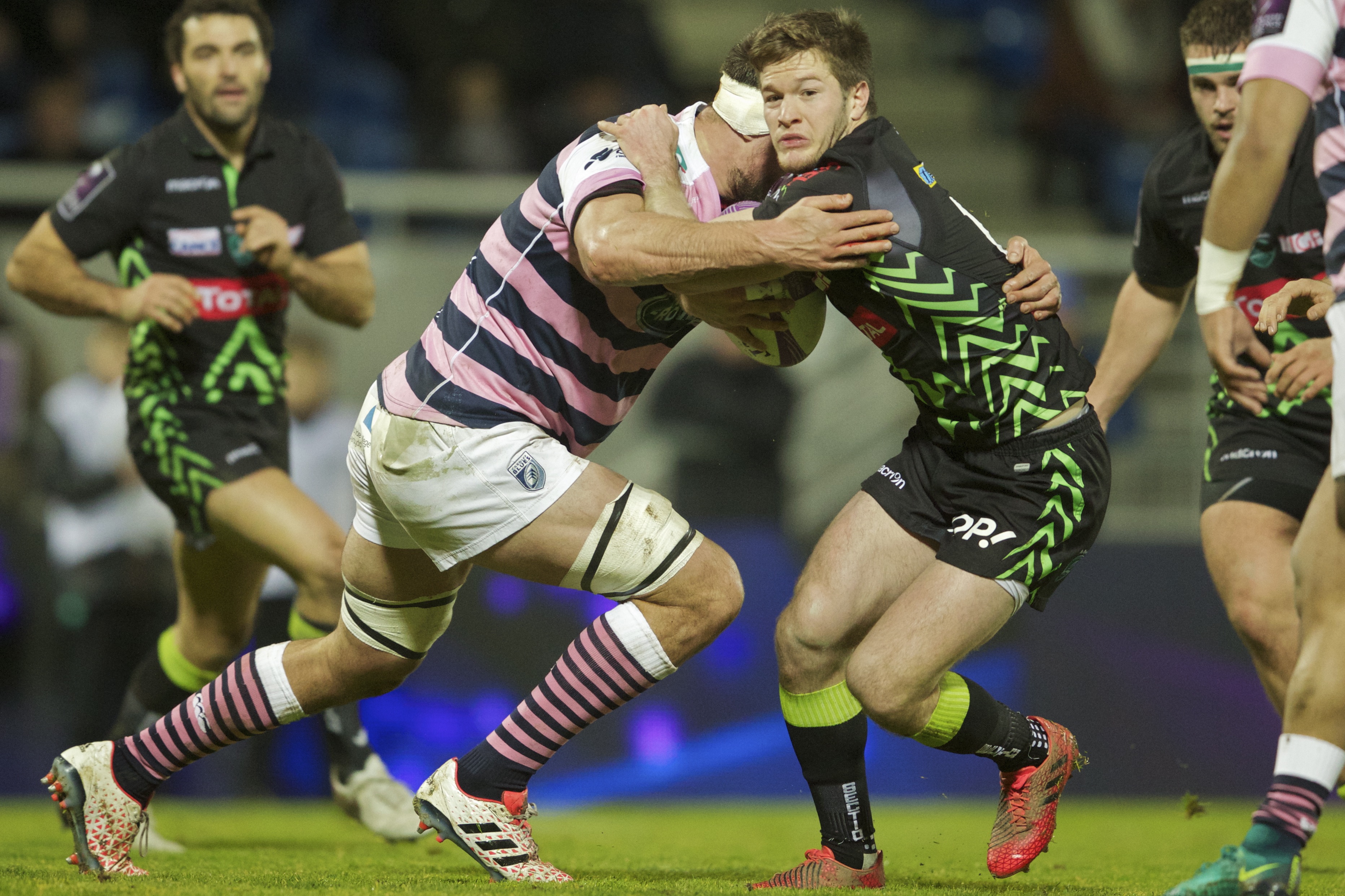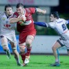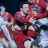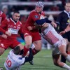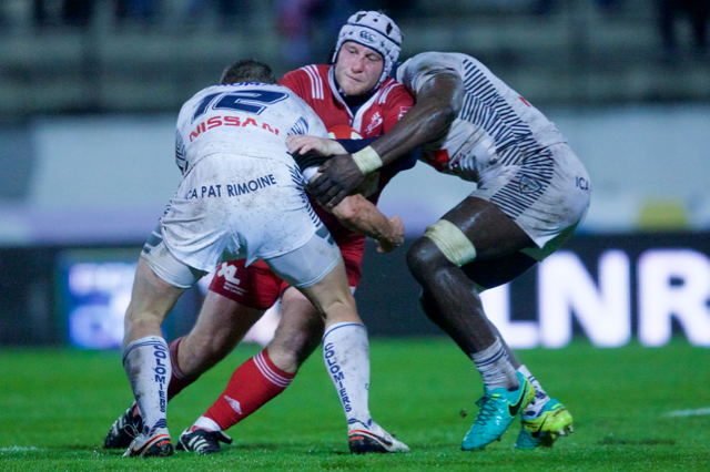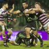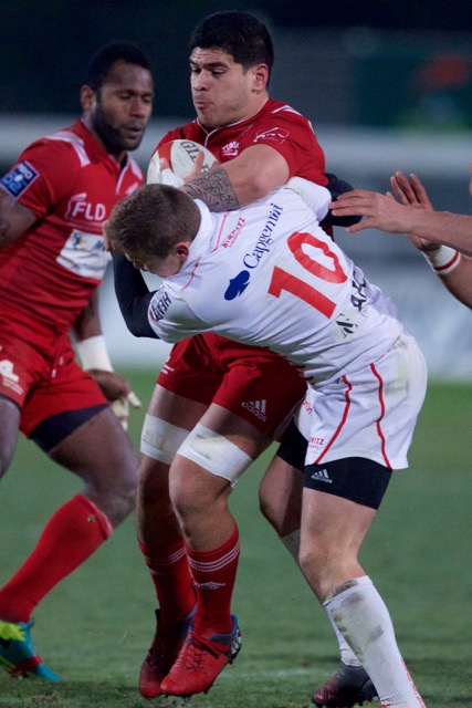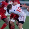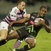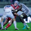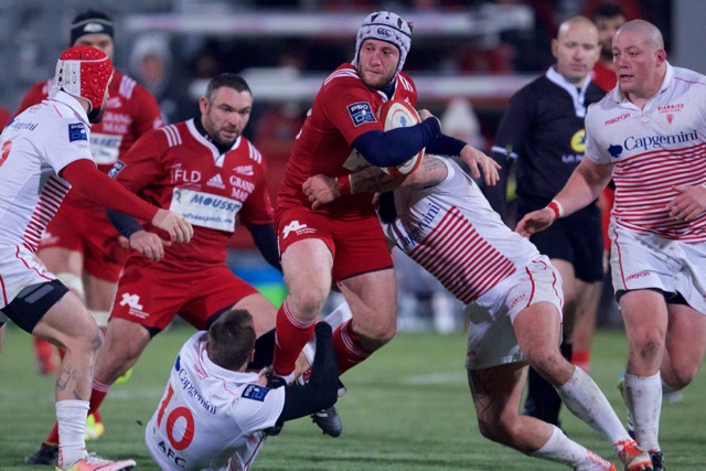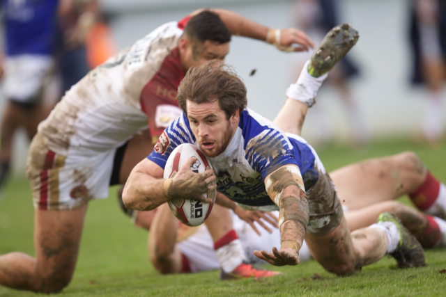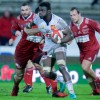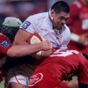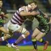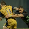 Rhys Curran le deuxième ligne Australien de Toulouse plaque le demi d’ouverture Richie Myler des Dragons pour ce match de préparation à la super league