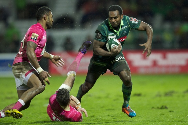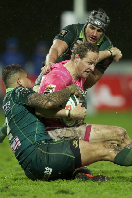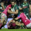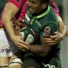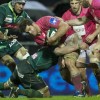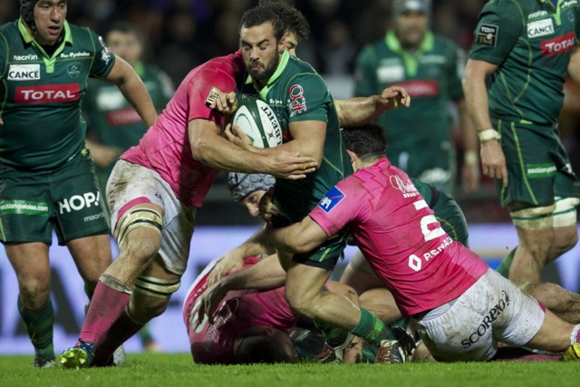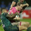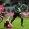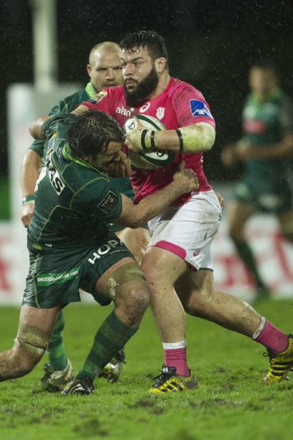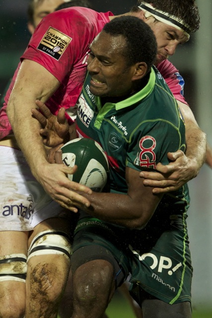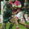 Damien Traille l’international Français aux 86 sélections tente de stopper Baptiste Serin le demi-de-mêlée de l’U.B.B. lors de ce match de championnat de France de TOP 14