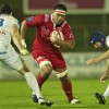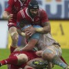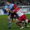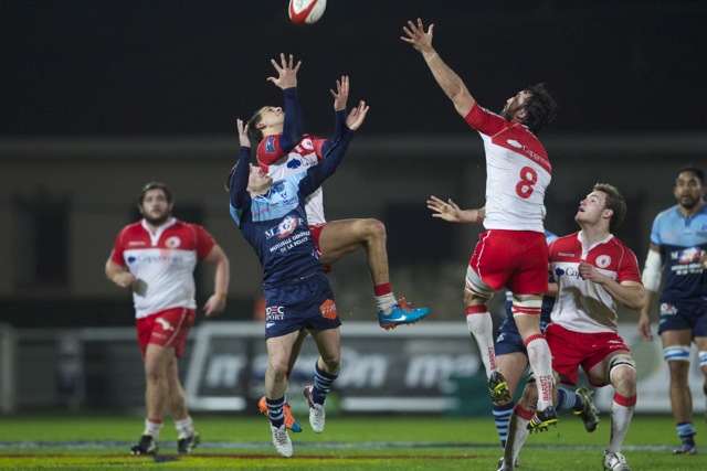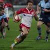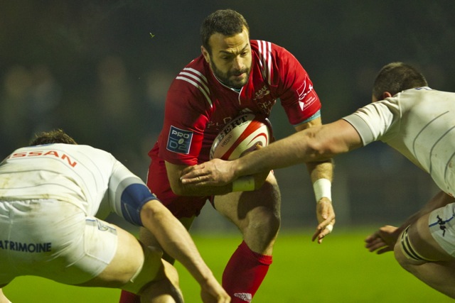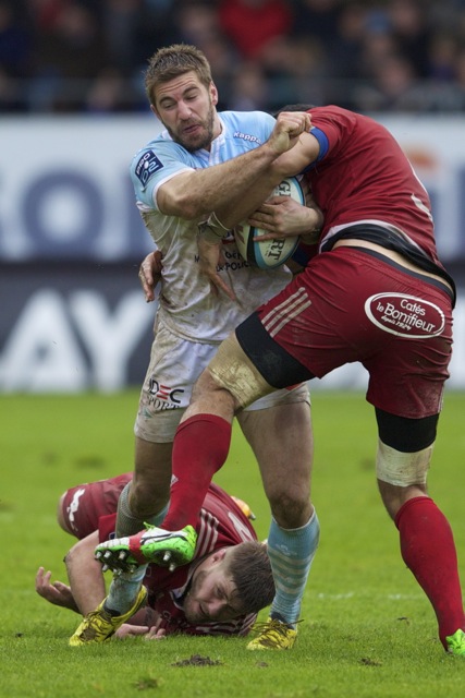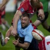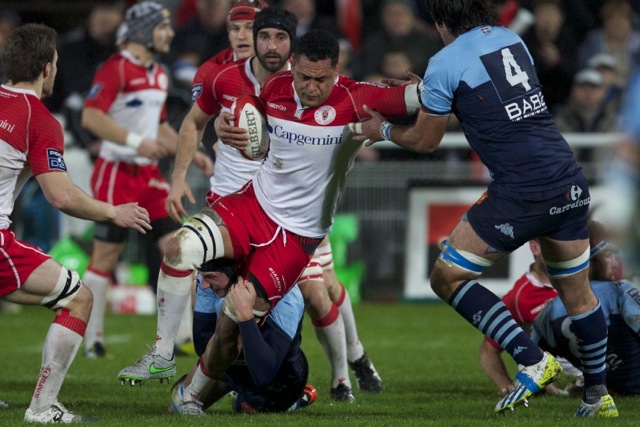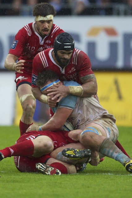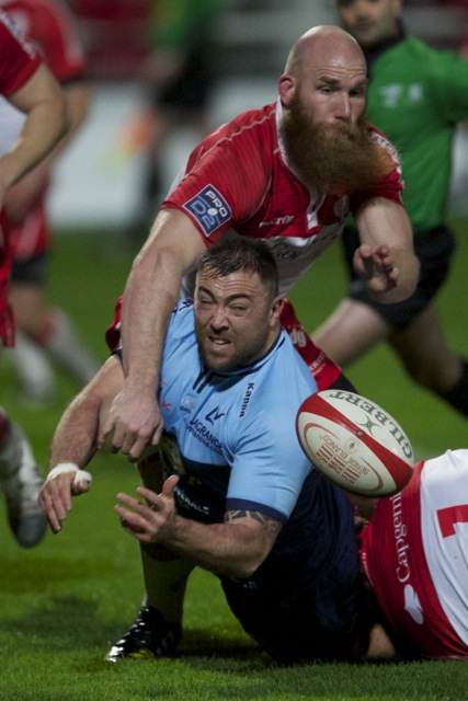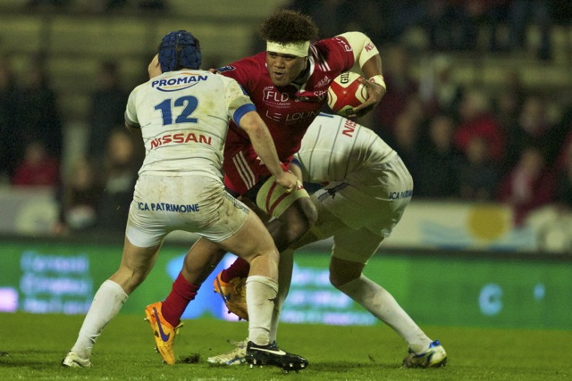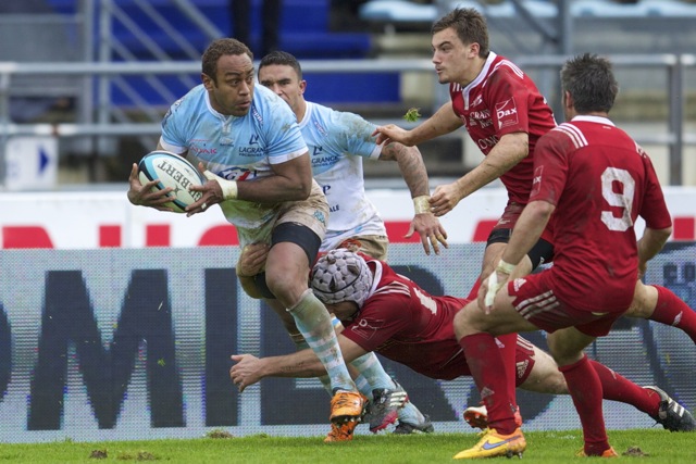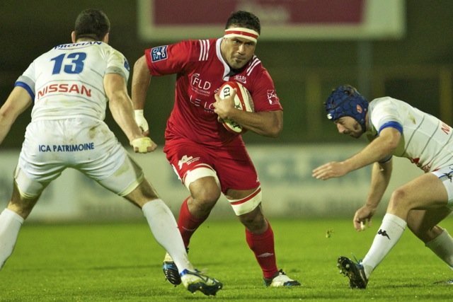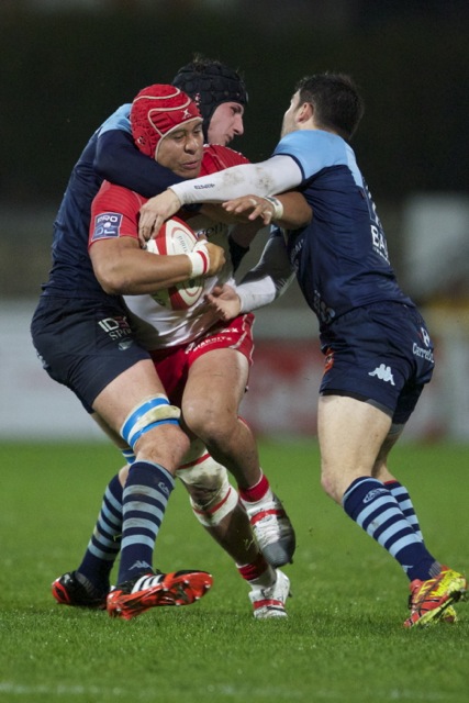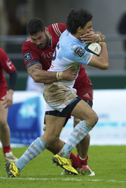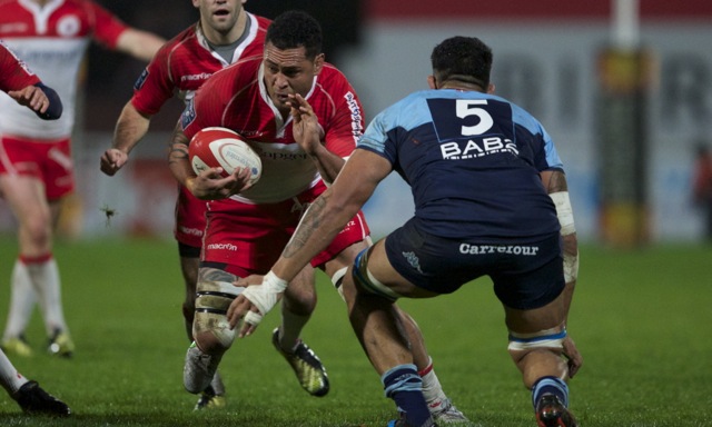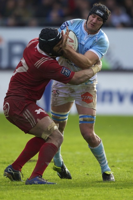 Ueleni Fono le troisième ligne Tongien aux 4 sélections charge contre Pelu Taele seconde ligne Samoan de l’aviron Bayonnais aux 8 sélections pour les îles Samoa lors du derby Basque comptant pour le championnat de PRO D2