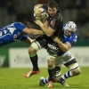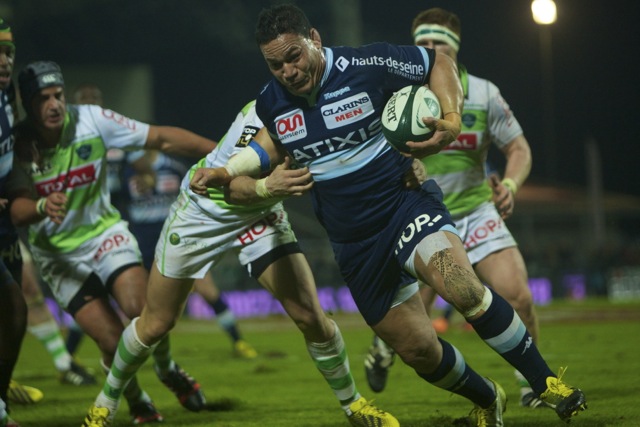 Rémi Talés le demi d’ouverture international de Paris se fait stopper lors du match comptant pour le championnat de TOP 14