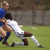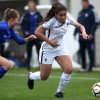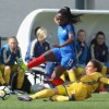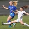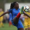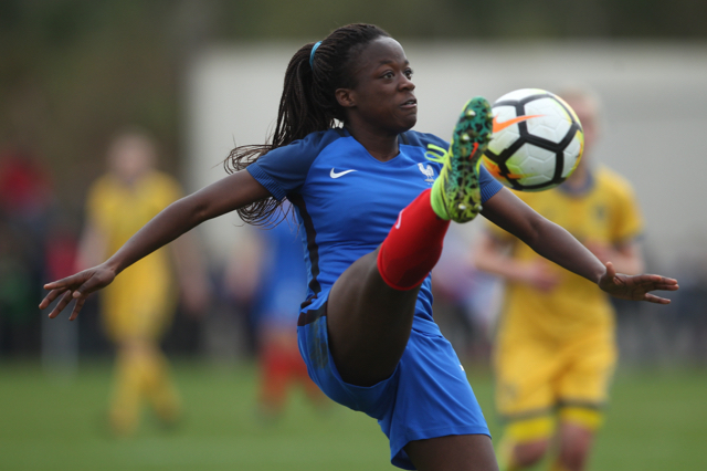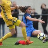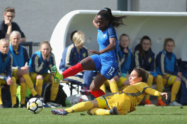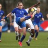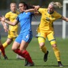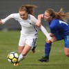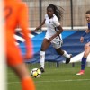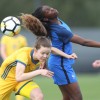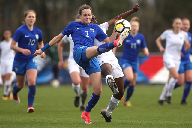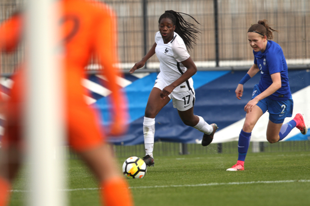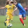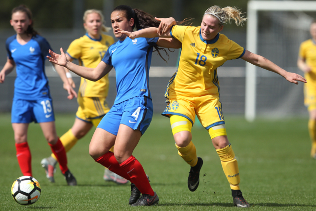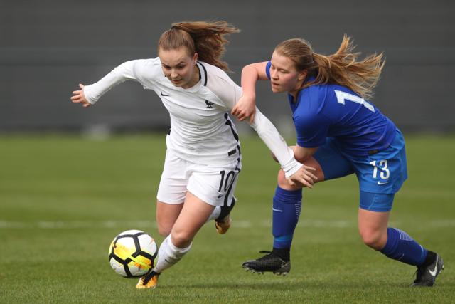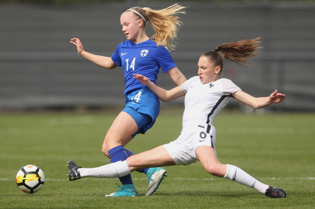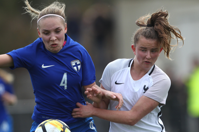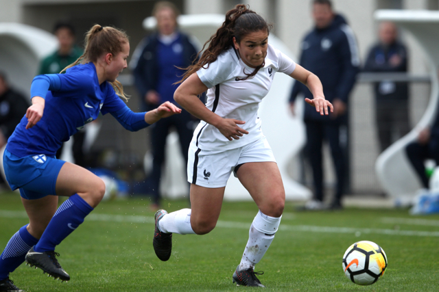 Malaury Craff la joueuse Française au contact avec la défenseuse Finlandaise Kaisa Juvonen lors de ce match de tour qualificatif pour la coupe d’Europe des nations féminines, moins de 17 ans.