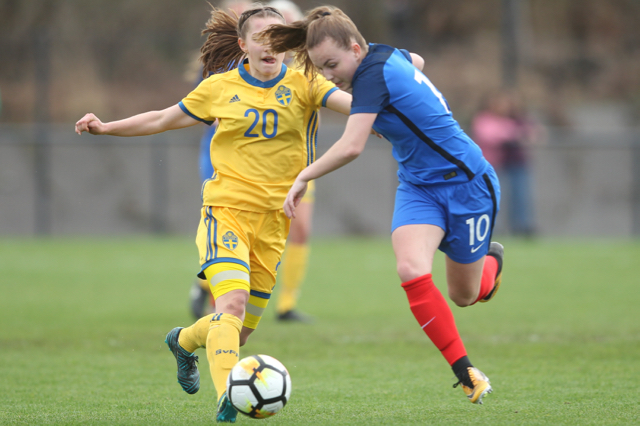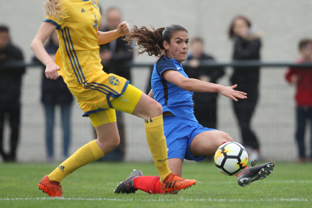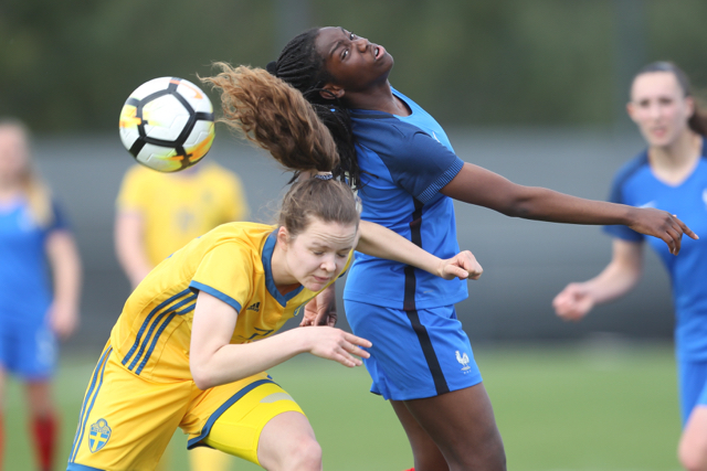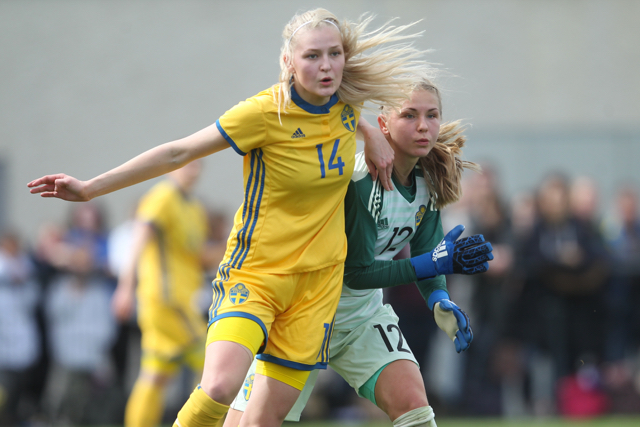 Kajsa Ekström la défenseuse Suédoise et la Gardienne de but Sara Wexén sur le qui-vive lors de la défaite de leurs équipe pour ce tournoi qualificatif pour la coupe d’Europe des moins de 17 ans