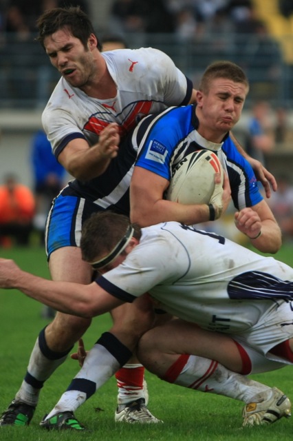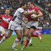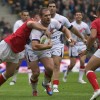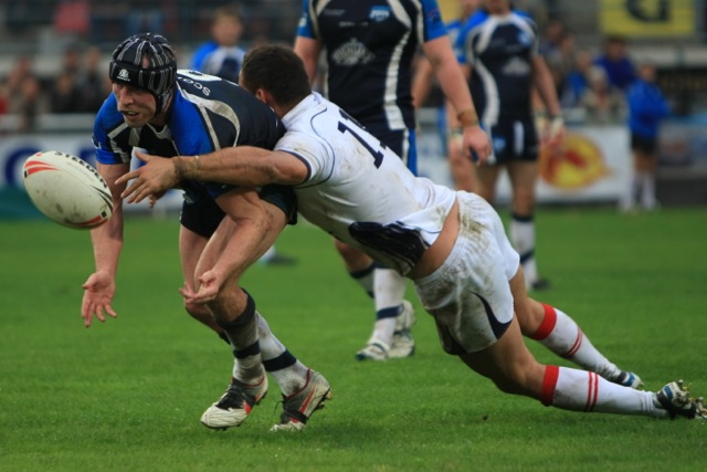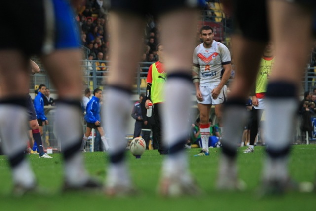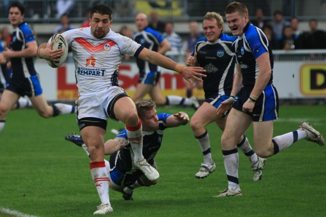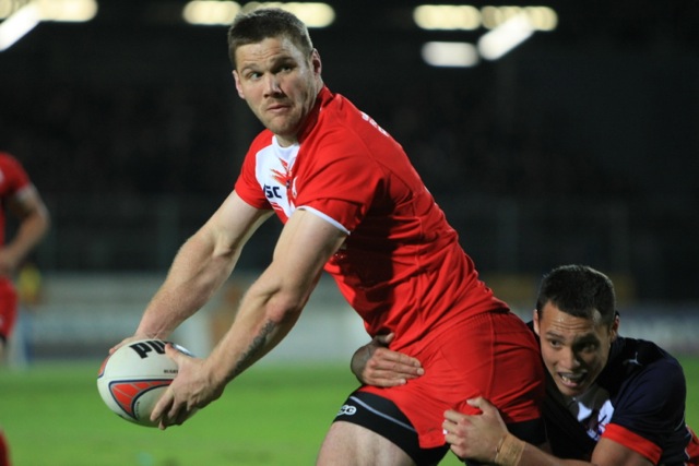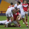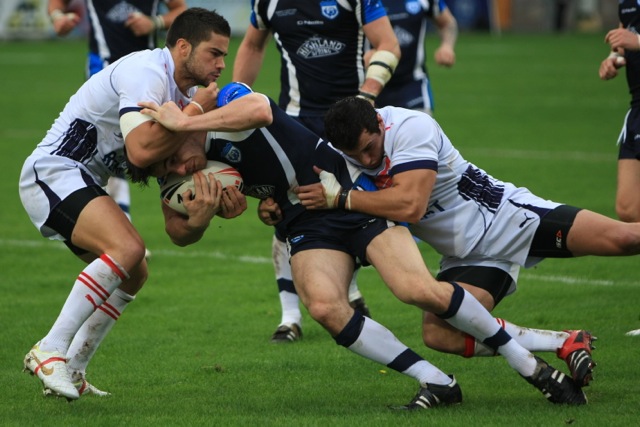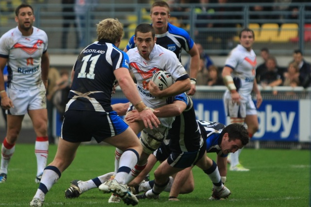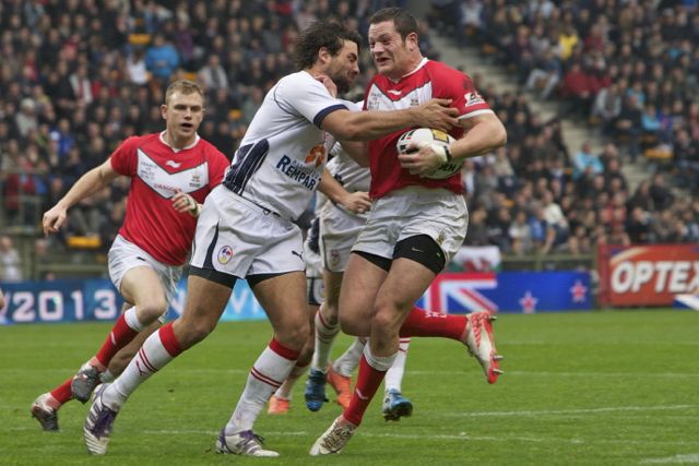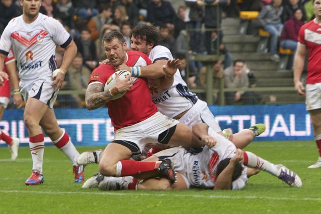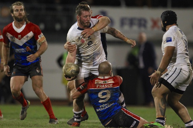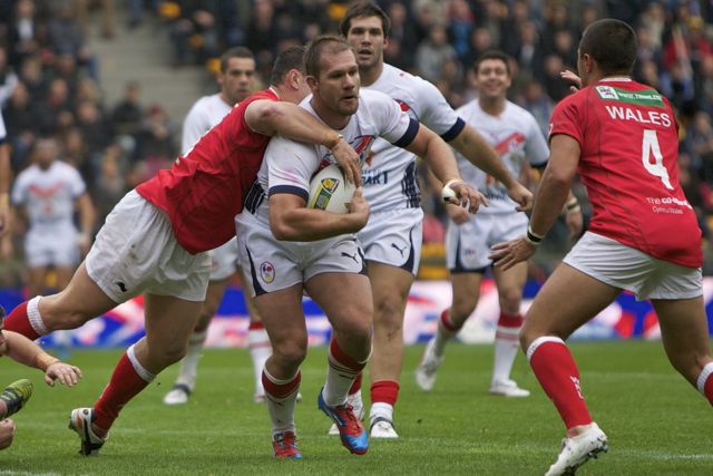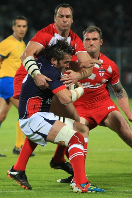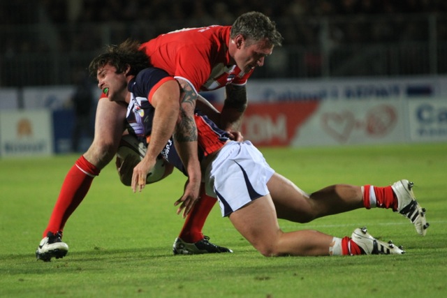 Jason Baitieri ceinturé par Jamie Peacock capitaine d’Angleterre au 47 sélections sous le maillot de l’équipe d’Angleterre et de Grande-Bretagne lors de ce test match