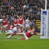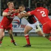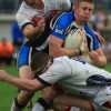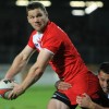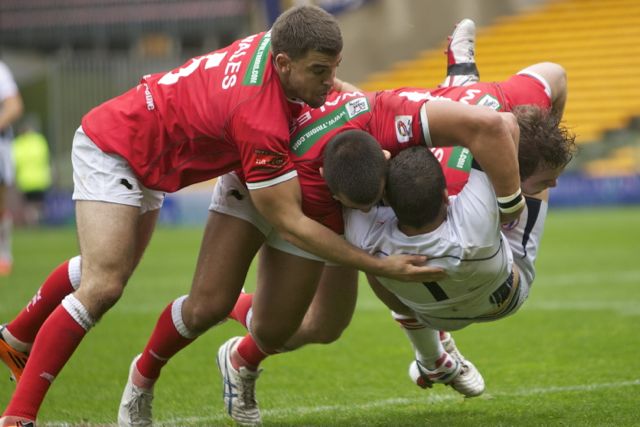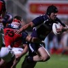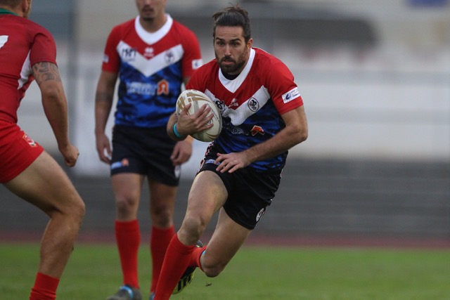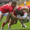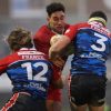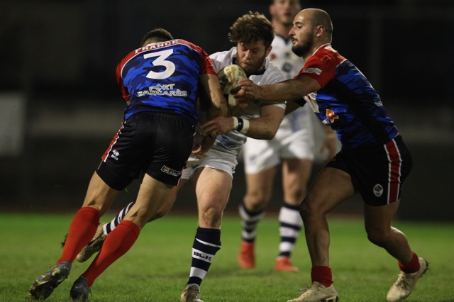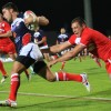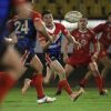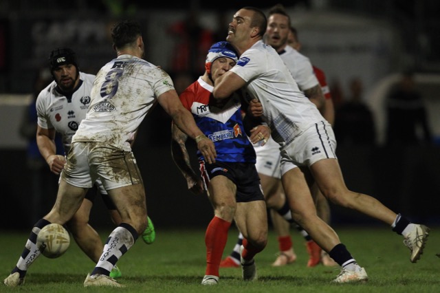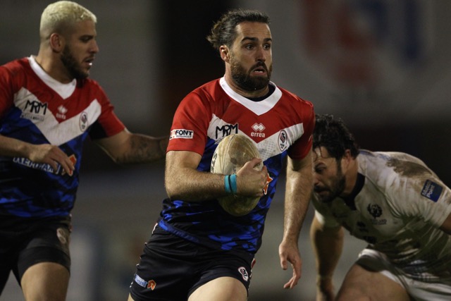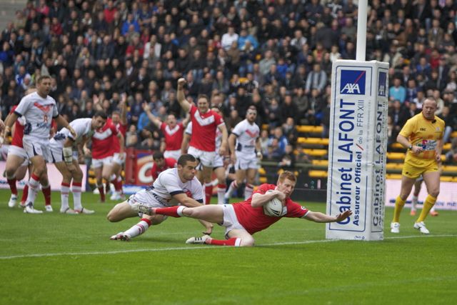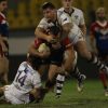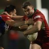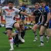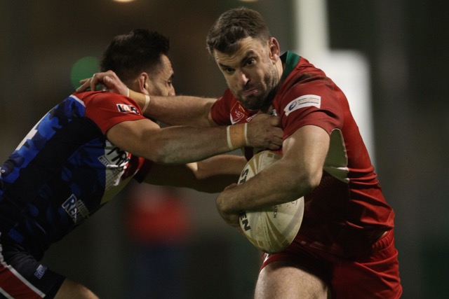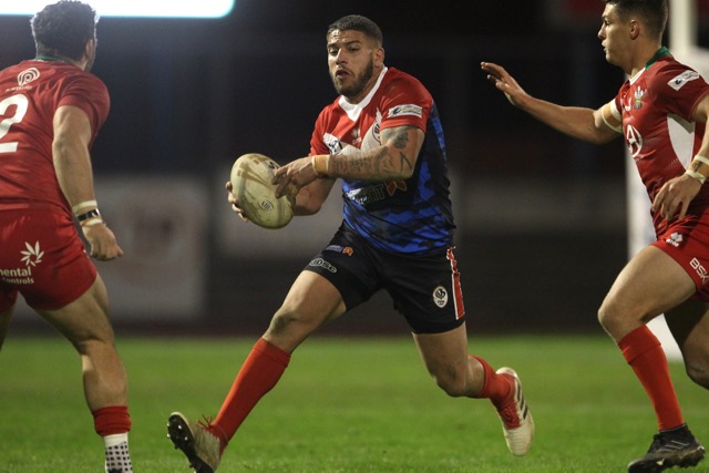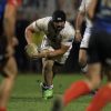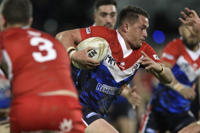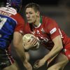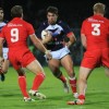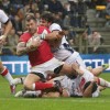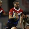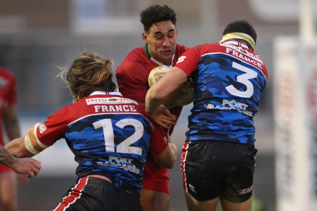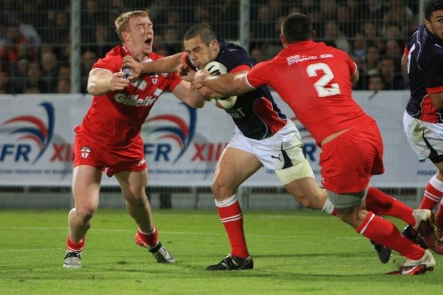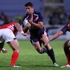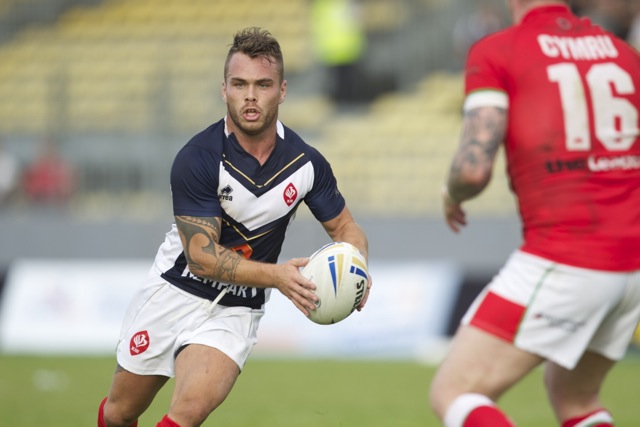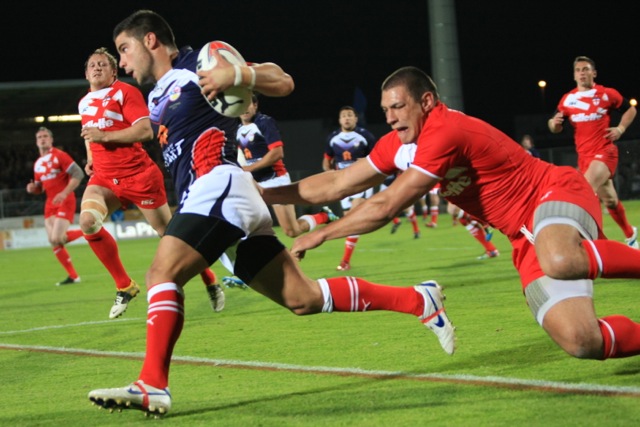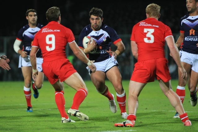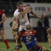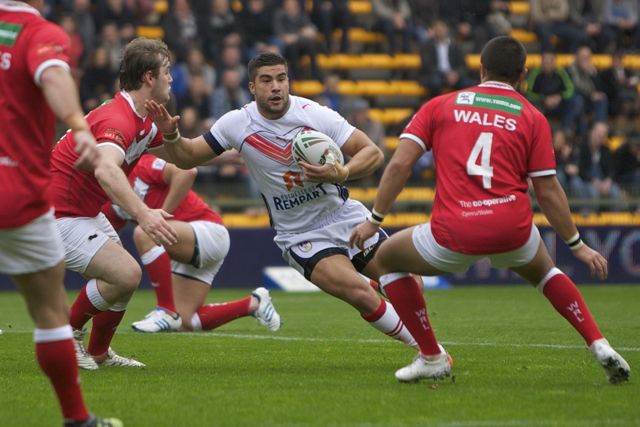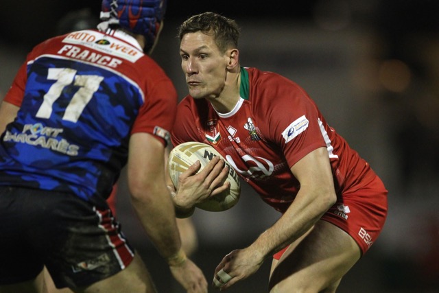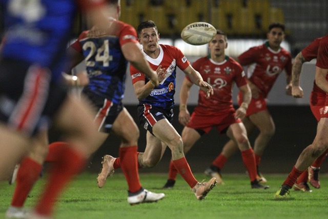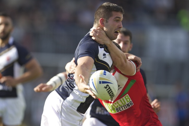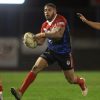 Lucas Albert le demi d’ouverture des Dragons Catalans transperce la défense du Pays-de-Galle