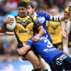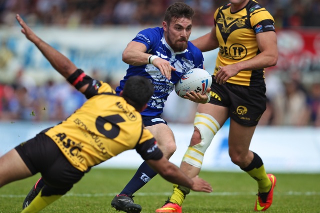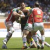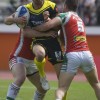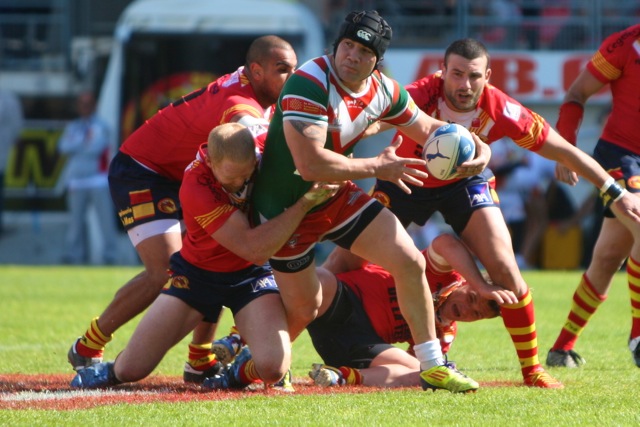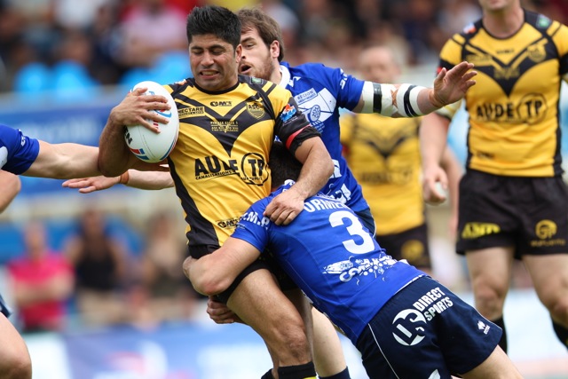 Andrew Bentley le seconde ligne de Toulouse stop Amar Sabri le joueur de Carcassonne lors de la finale de championnat de France