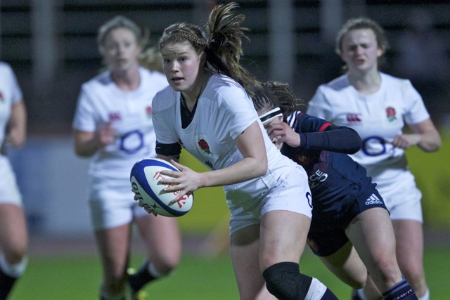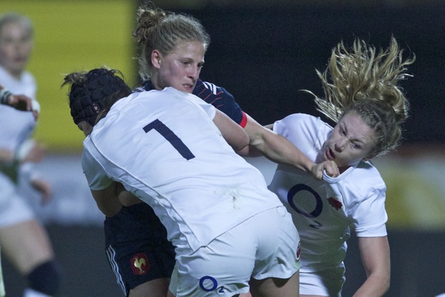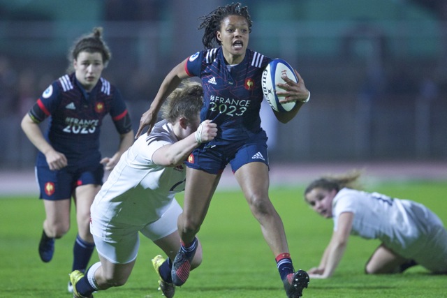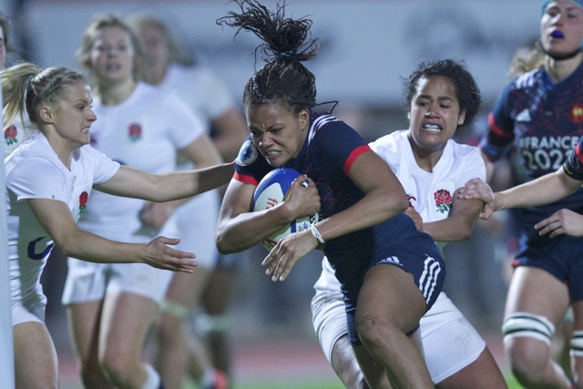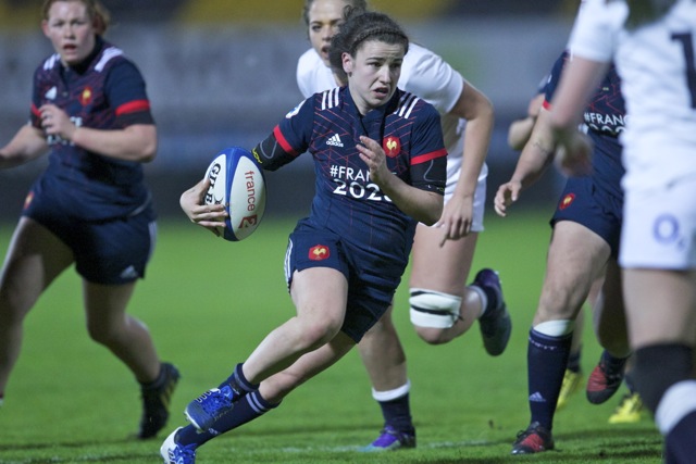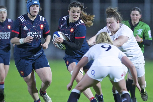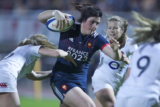 Lucie Vinacua la troisième ligne Française de transperce la devance anglaise à plusieurs reprises lors de la victoire l’équipe de France